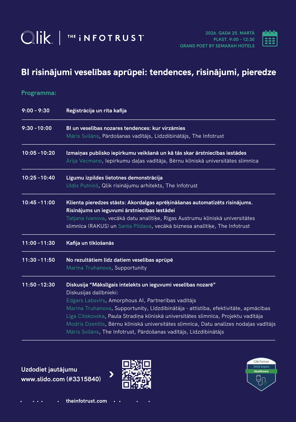 Pasākums paredzēts: veselības aprūpes iestāžu vadītājiem, iepirkumu speciālistiem, ekonomistiem, personāla speciālistiem, datu analītiķiem, statistiķiem un citiem interesentiem